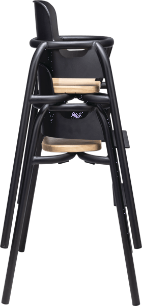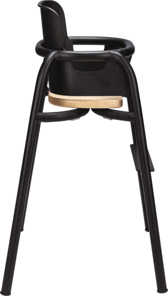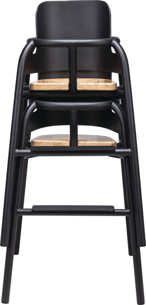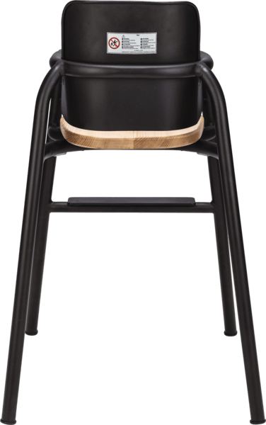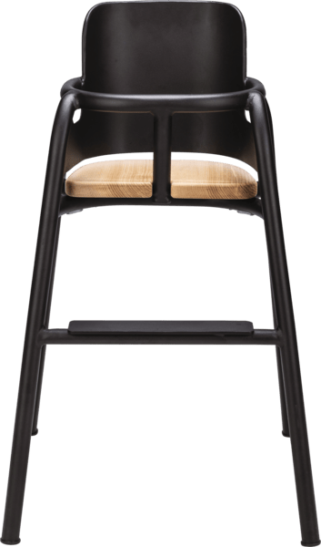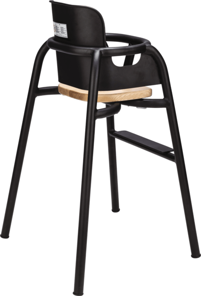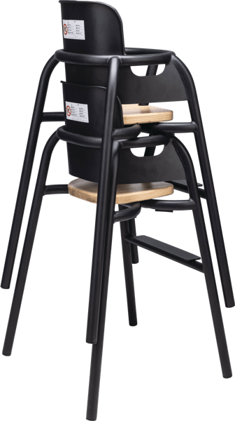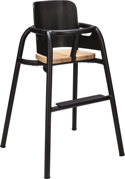 A contemporary children’s high chair with a sleek black frame and warm timber seat, designed to offer comfort, safety and style in busy hospitality environments.
